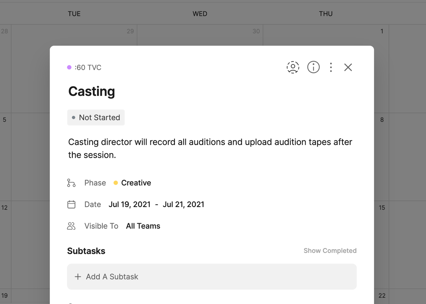 Within each task, you can add as many subtasks as you'd like. Start by clicking Add a Subtask and adding the subtask title.