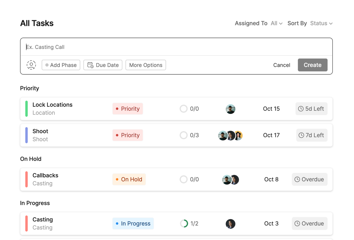 Assemble utilizes tasks to keep track of what your team is working on. Tasks appear on your calendar and in your task list, and can be created in one of two ways.