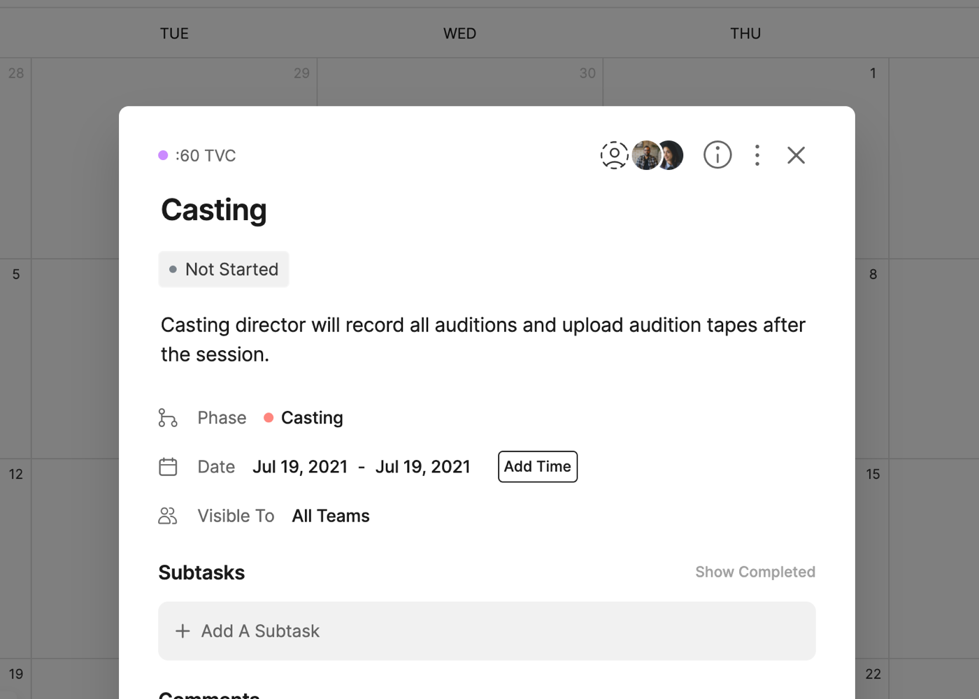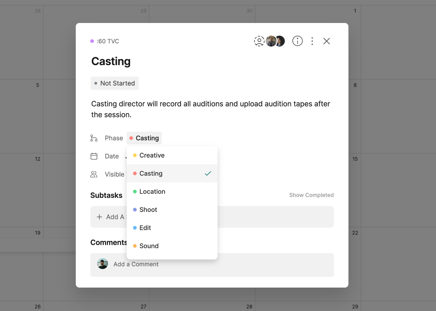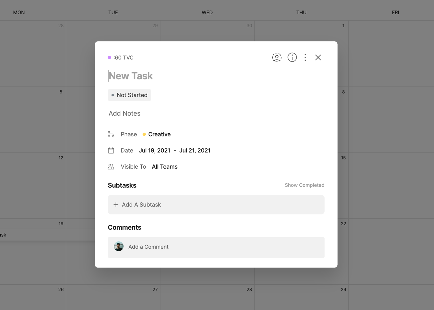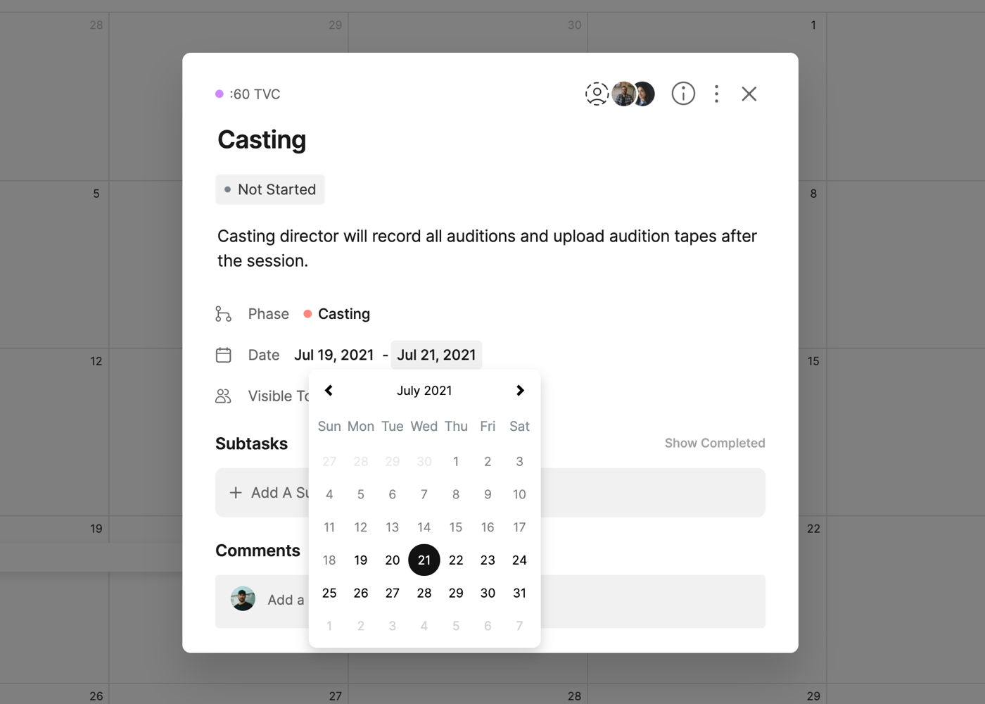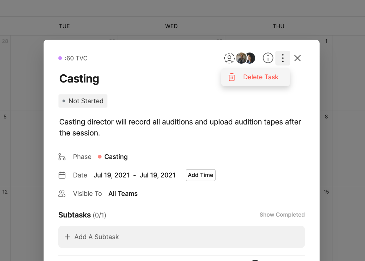 Each task on the calendar will also include icons for the number of Subtasks and the amount completed (i.e. 3/5) and the Assignees of the task.