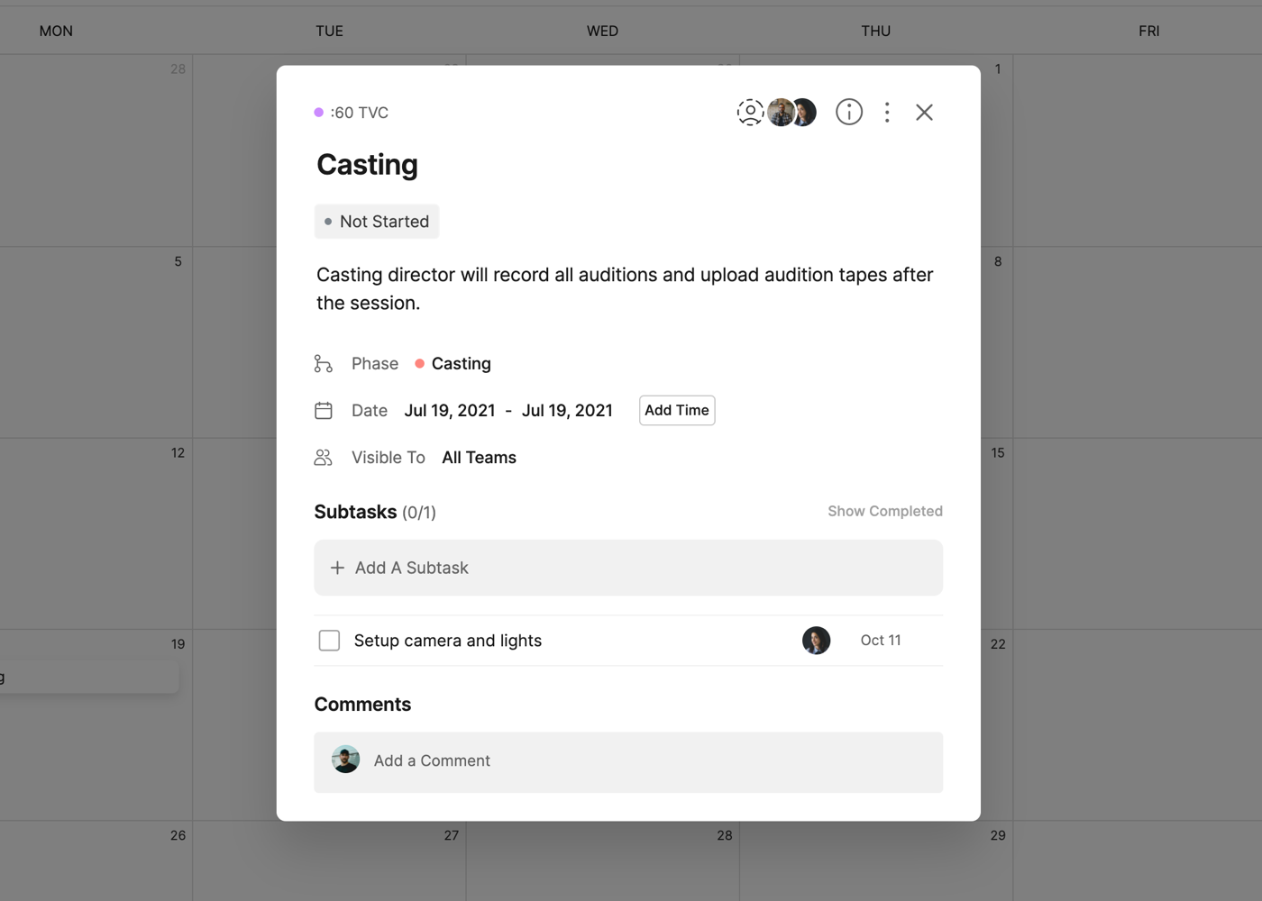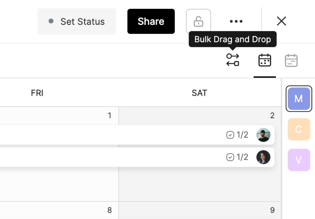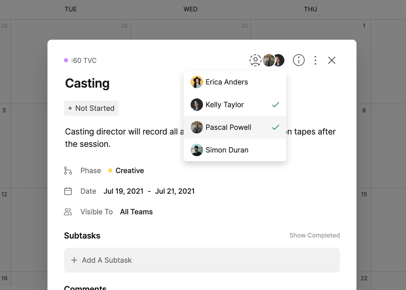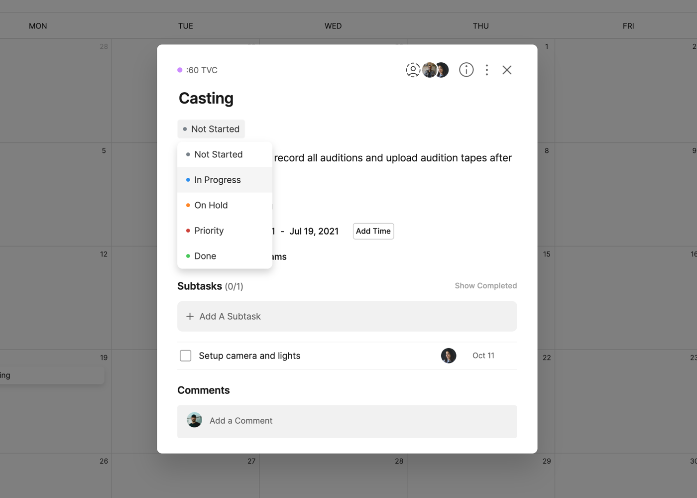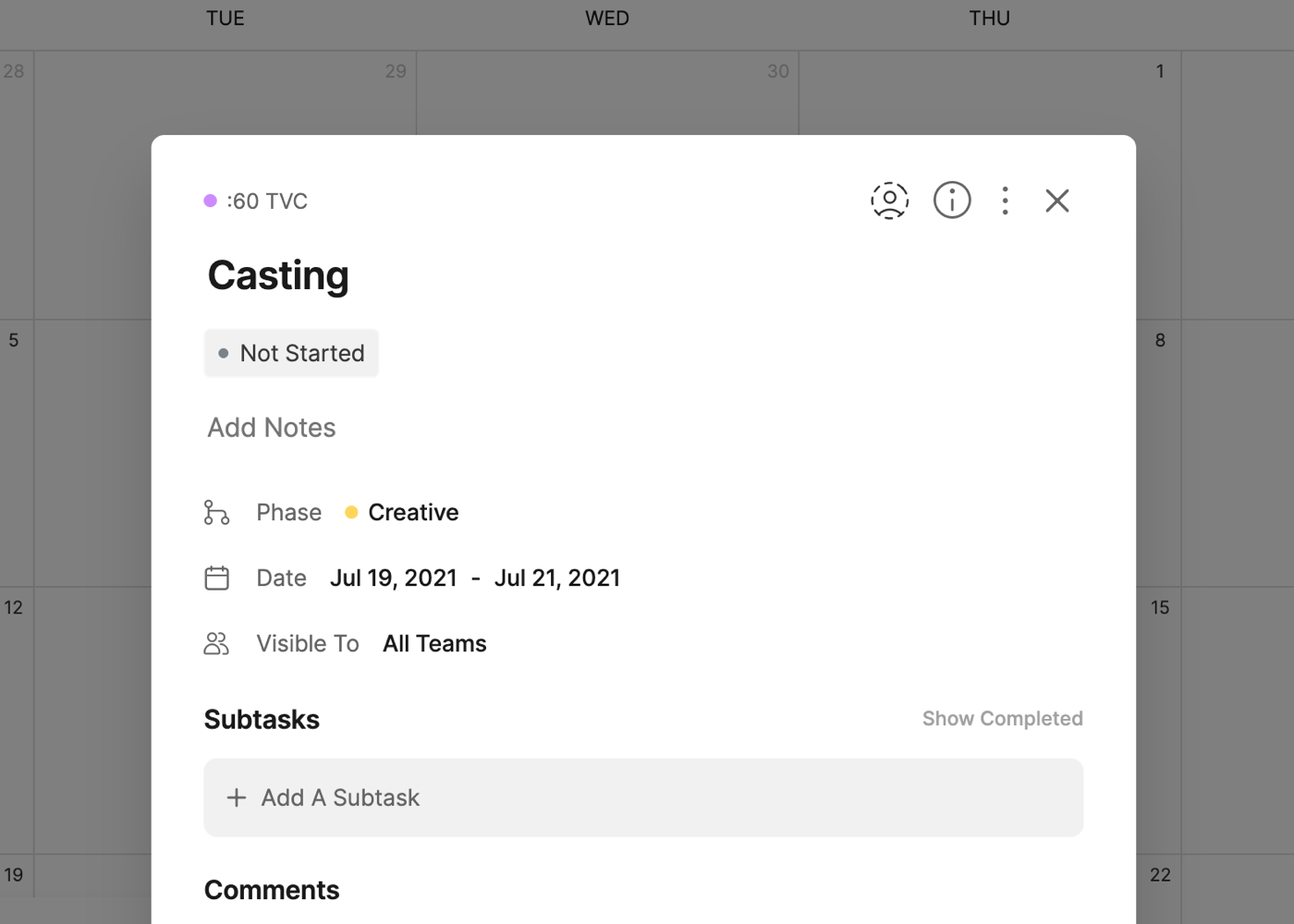 Each task on the calendar will also include icons for the number of Subtasks and the amount completed (i.e. 3/5) and the Assignees of the task.