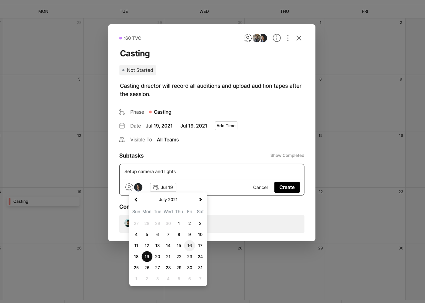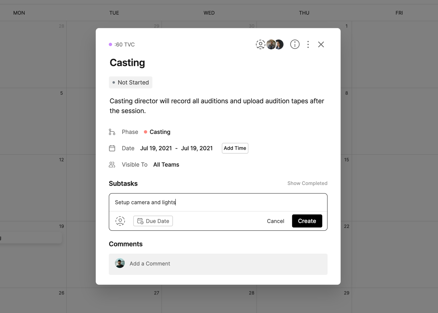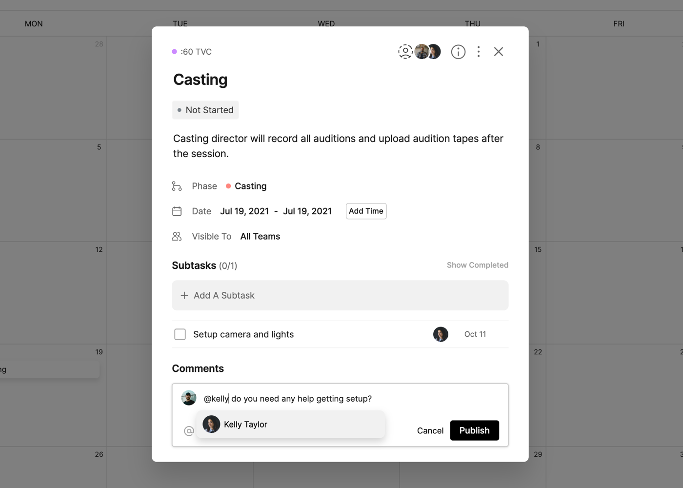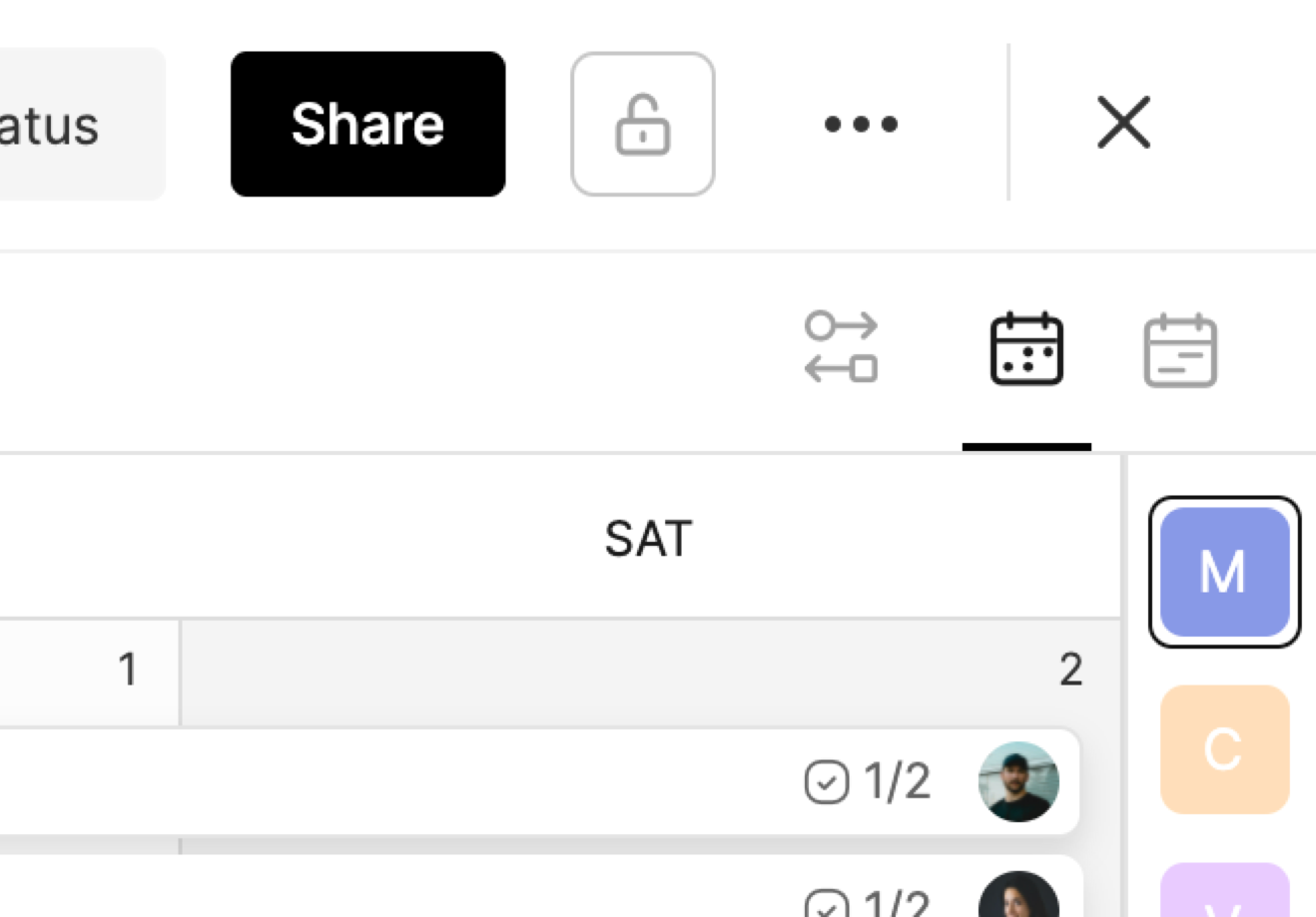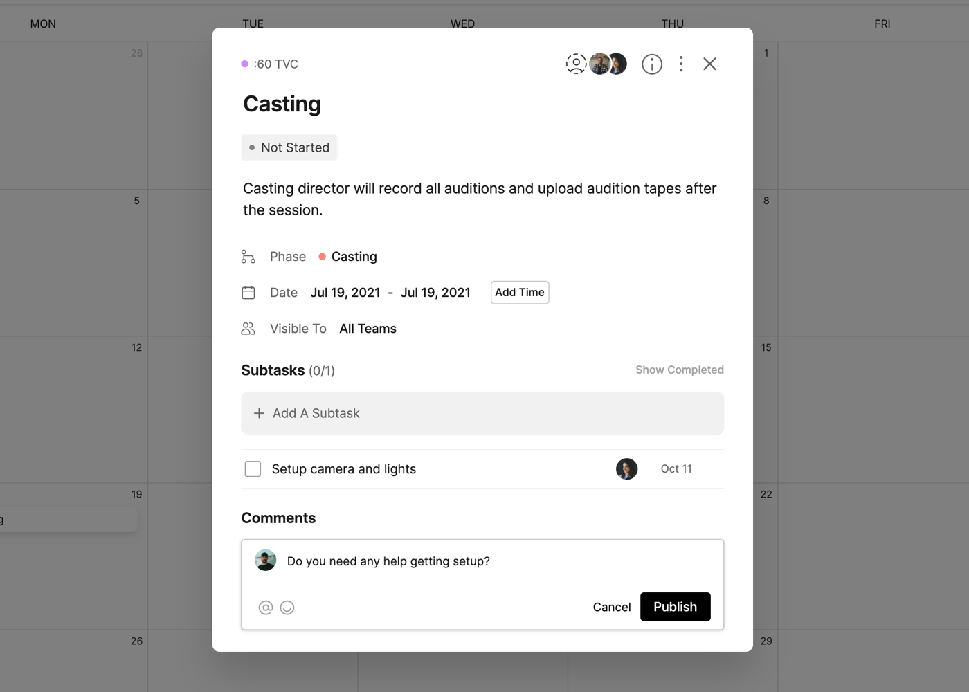 Each task on the calendar will also include icons for the number of Subtasks and the amount completed (i.e. 3/5) and the Assignees of the task.