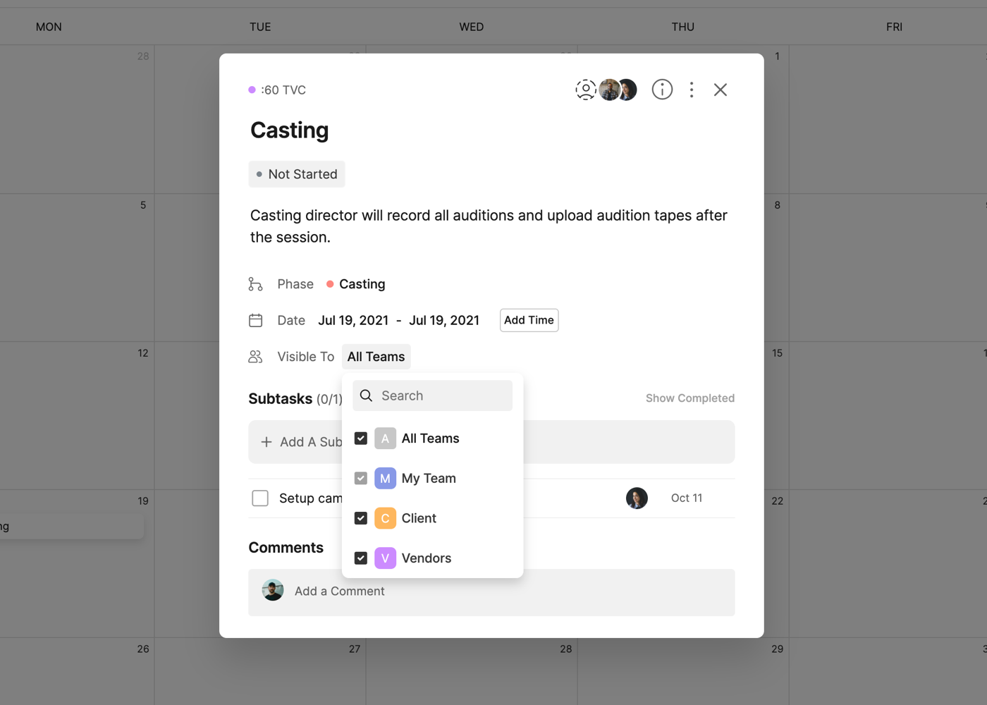 You can also select the privacy settings by clicking the Visible To section. This will bring up a dropdown list of the Teams in your project. Select the Teams that you want this task to be visible to.