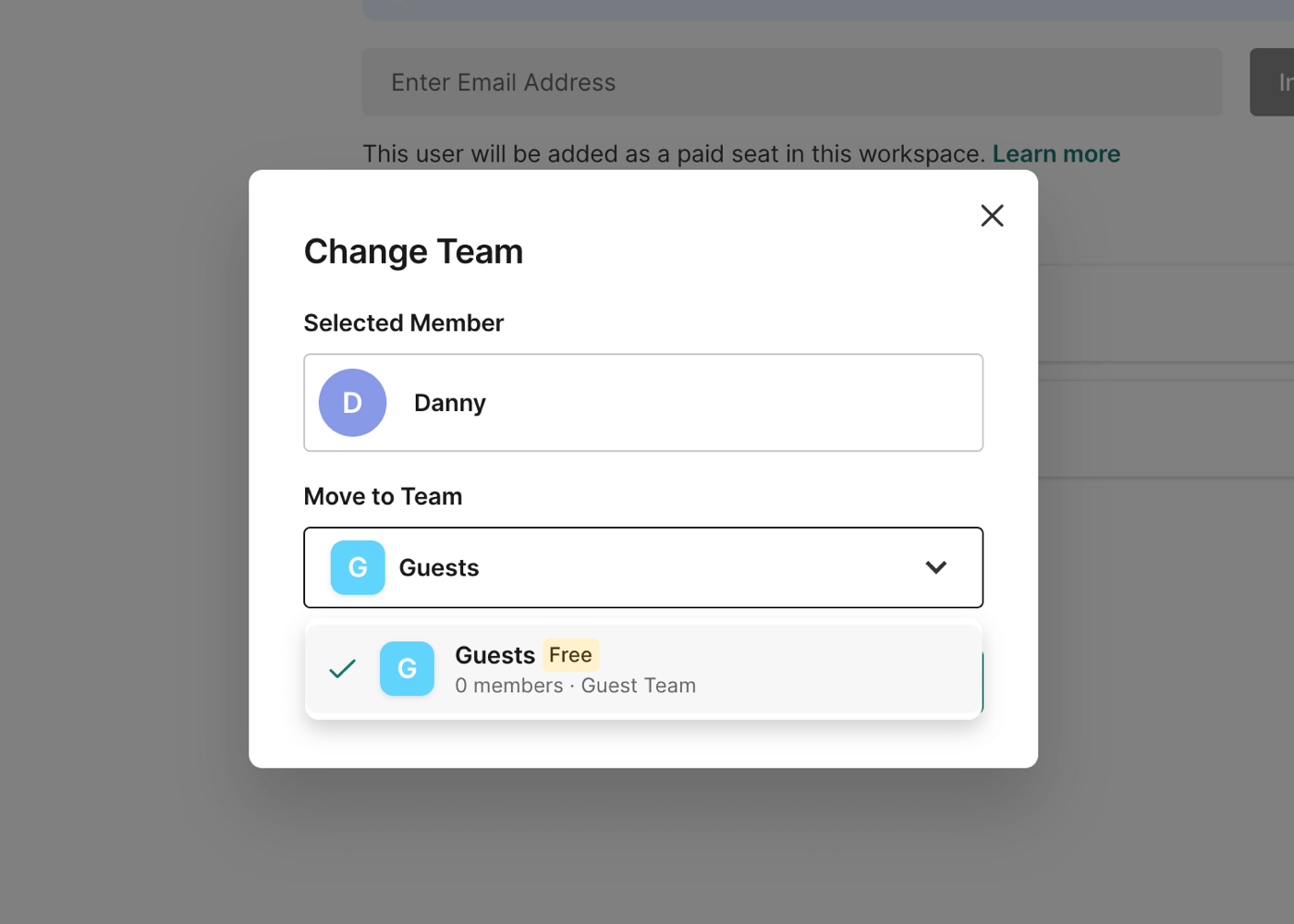 Guests cannot be added to the Workspace Team unless they are upgraded to a teammate. If you attempt to move a guest to the workspace team, you will be prompted to upgrade them to a teammate.