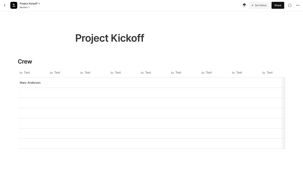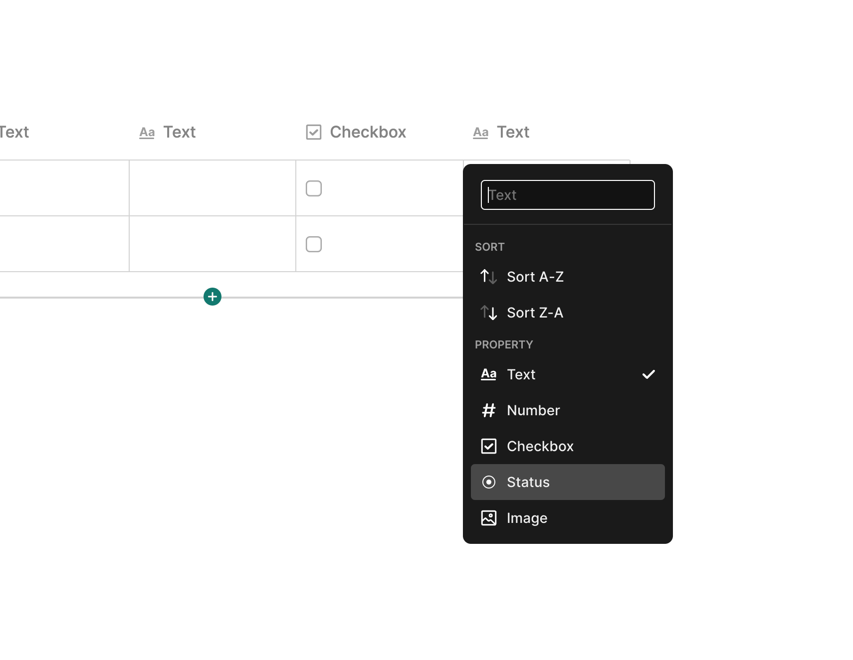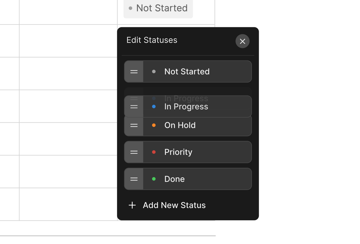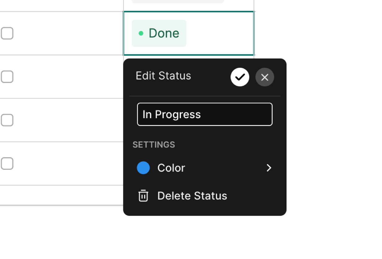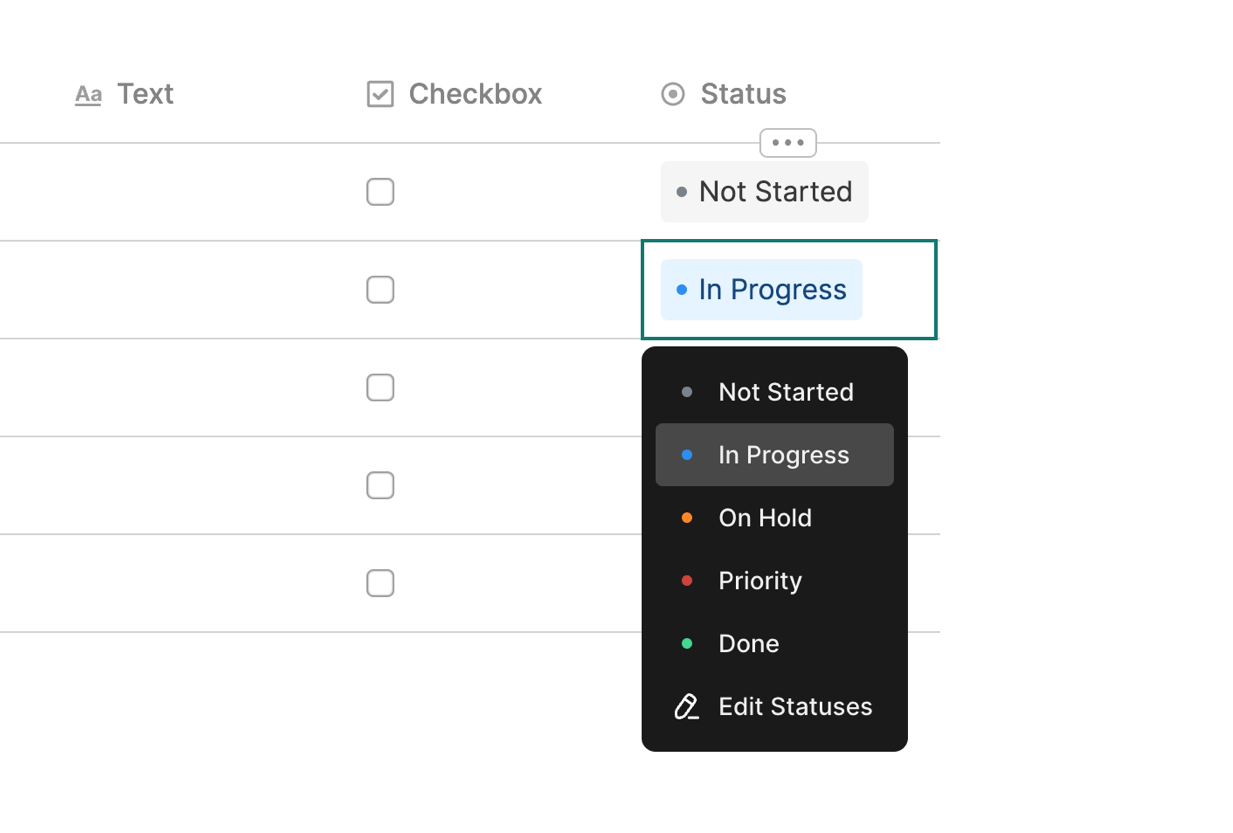 To add statuses to a table, click the Column Header of any column and then select Status to change the Column Type to Statuses.