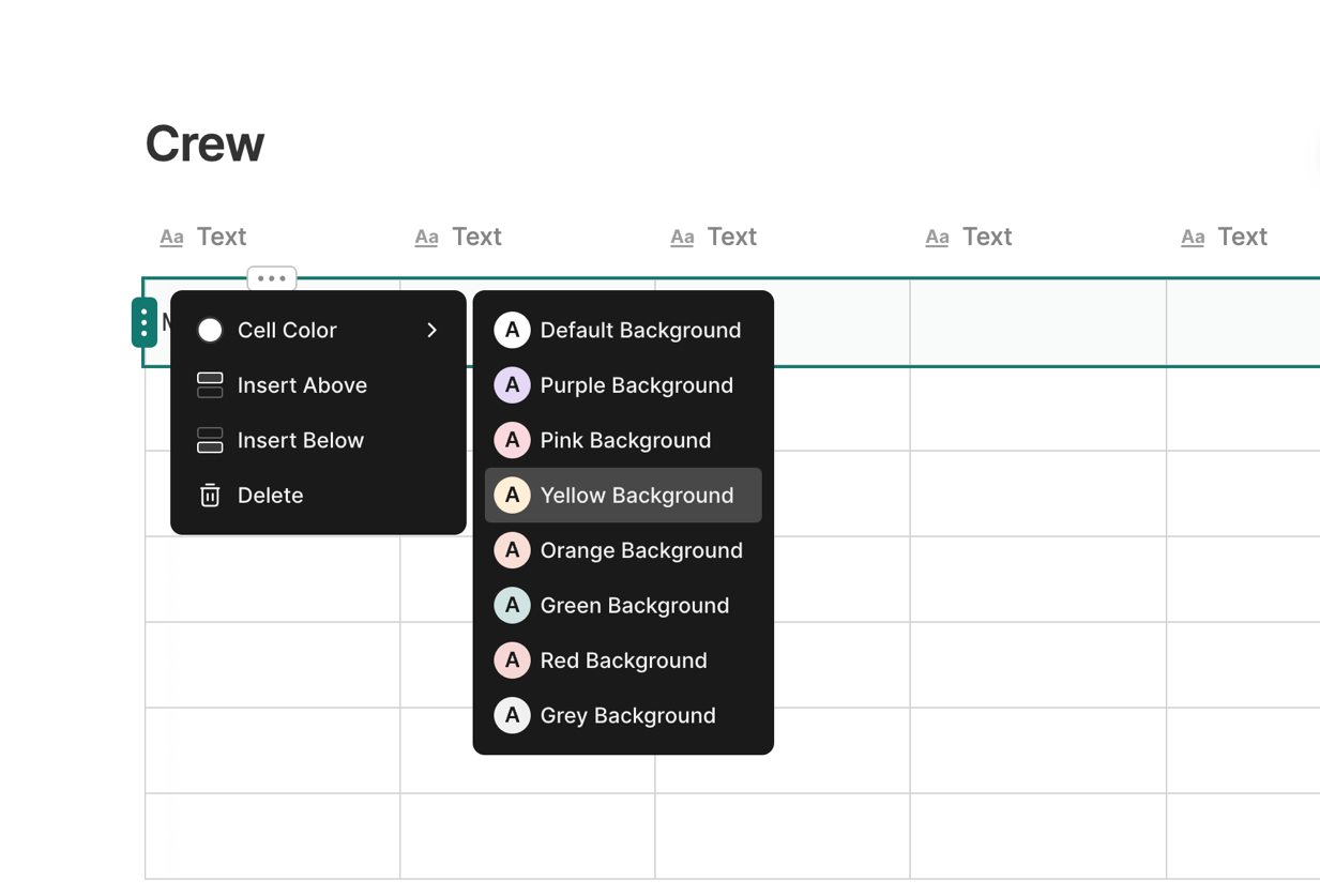 To change the background color of a row or column, hover the table and click the Row Menu or Column Menu, and then select Cell Color to change the color of the entire row or column.