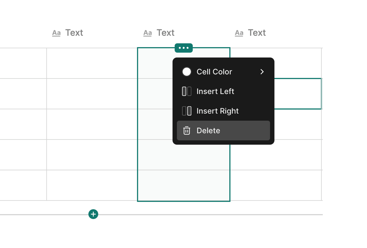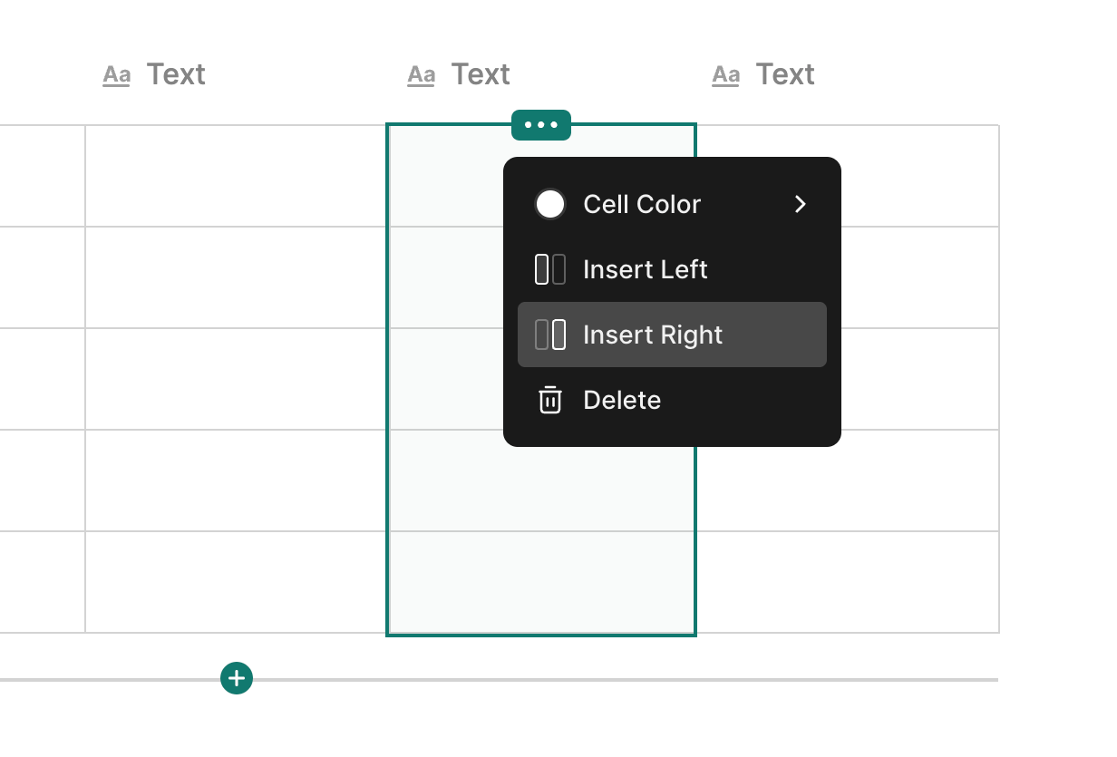 To add a new column, hover the table and click Column Menu and select Insert Left or Insert Right.