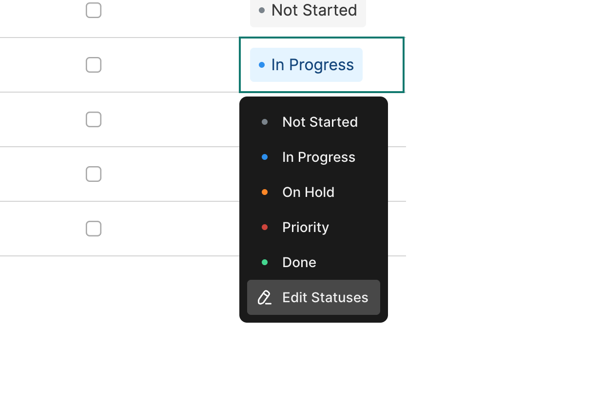 Click a Status to open the Status Options, then select a pre-set Status to change the status of the cell.