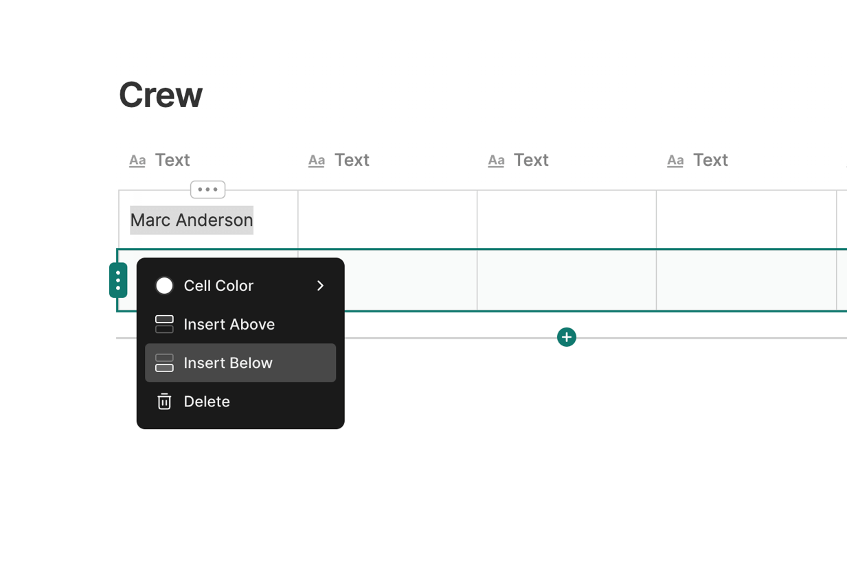 To add a new row, hover the table and click the Row Menu button. From this menu you can Insert Above or Insert Below to add a new row to your table.