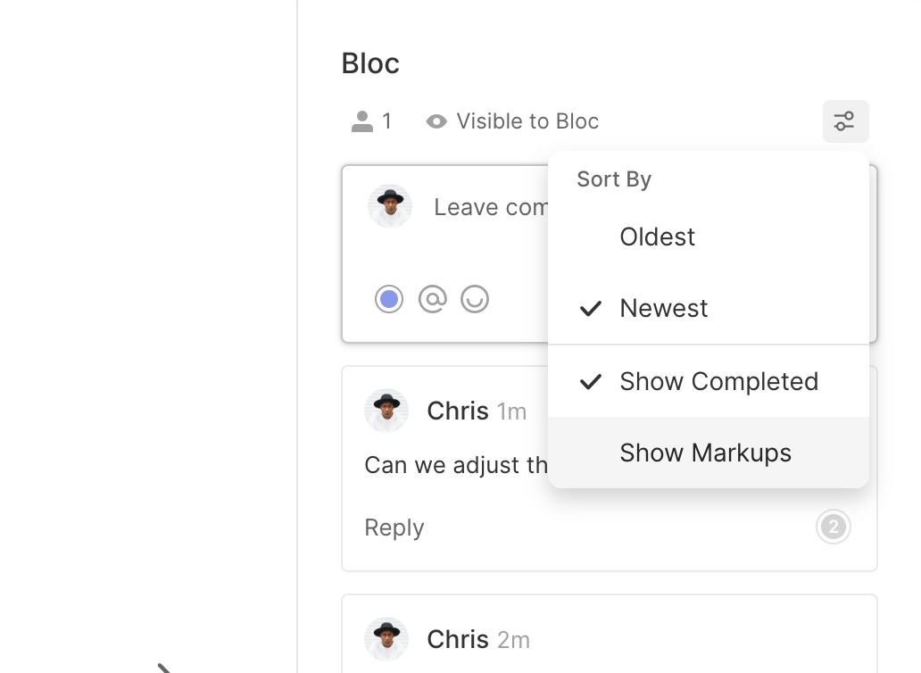 To hide all markups, click the Filter icon and unselect Show Markups. This will remove all markups from view, but the comments will remain in the comment bar.