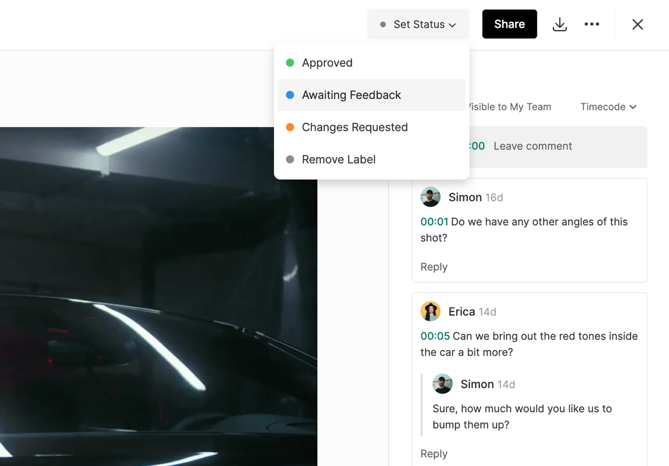 Once the status is changed, a new tag will be added to the asset thumbnail so that you can quickly view the status of all files from the folder view.