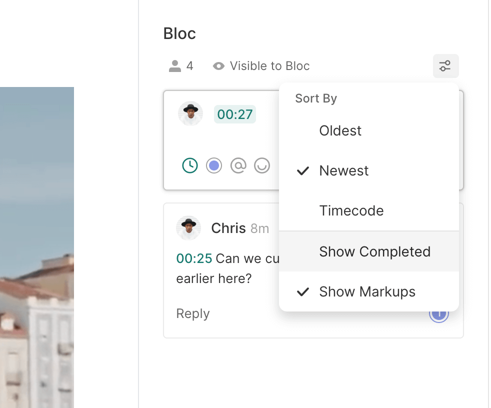 By default, when you mark a comment as complete, the comment will still be displayed. If you would prefer for comments to disappear once they are marked as complete, click the Filter options at the top of the feedback thread, and then deselect Show Completed. This will cause comments to be hidden once you mark them as complete. If there is a markup associated with the comment, the markup will be hidden as well.
