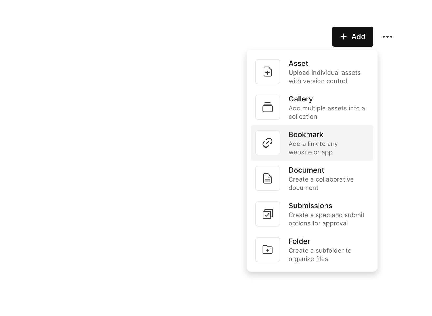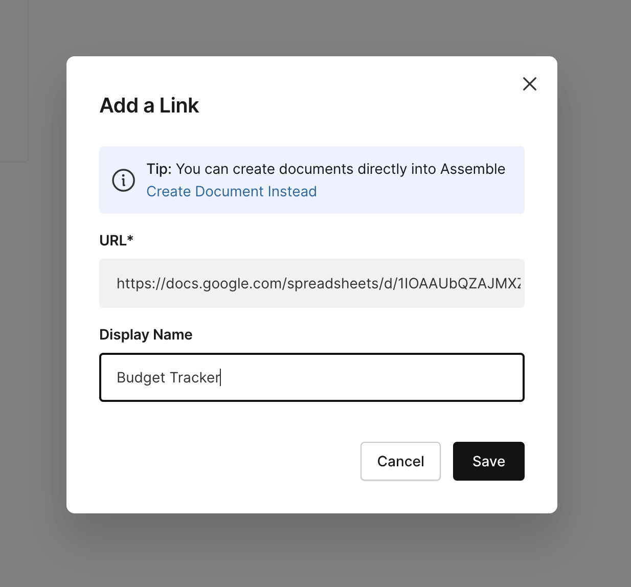 You can add links to any external website or app such as Google Docs, Dropbox, Figma and more to keep all of your files organized within Assemble.