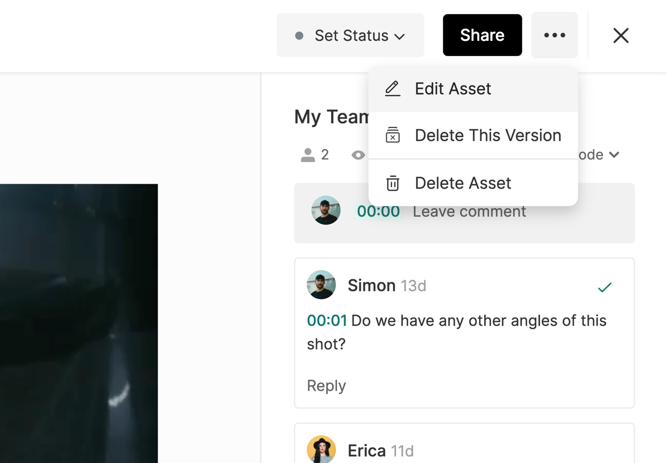To change the name of a standalone asset, open the asset and click the Three Dot Menu in the top right, and select Edit Asset.