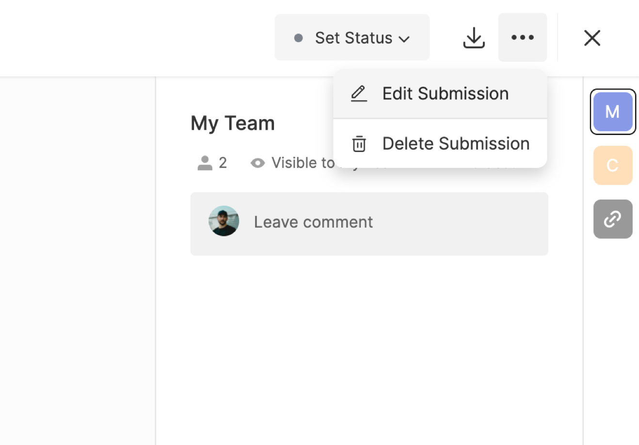 To change the details of the overall submissions file type, open the submissions you want to edit and click the Three Dot Menu in the top right, then select Edit Submissions.