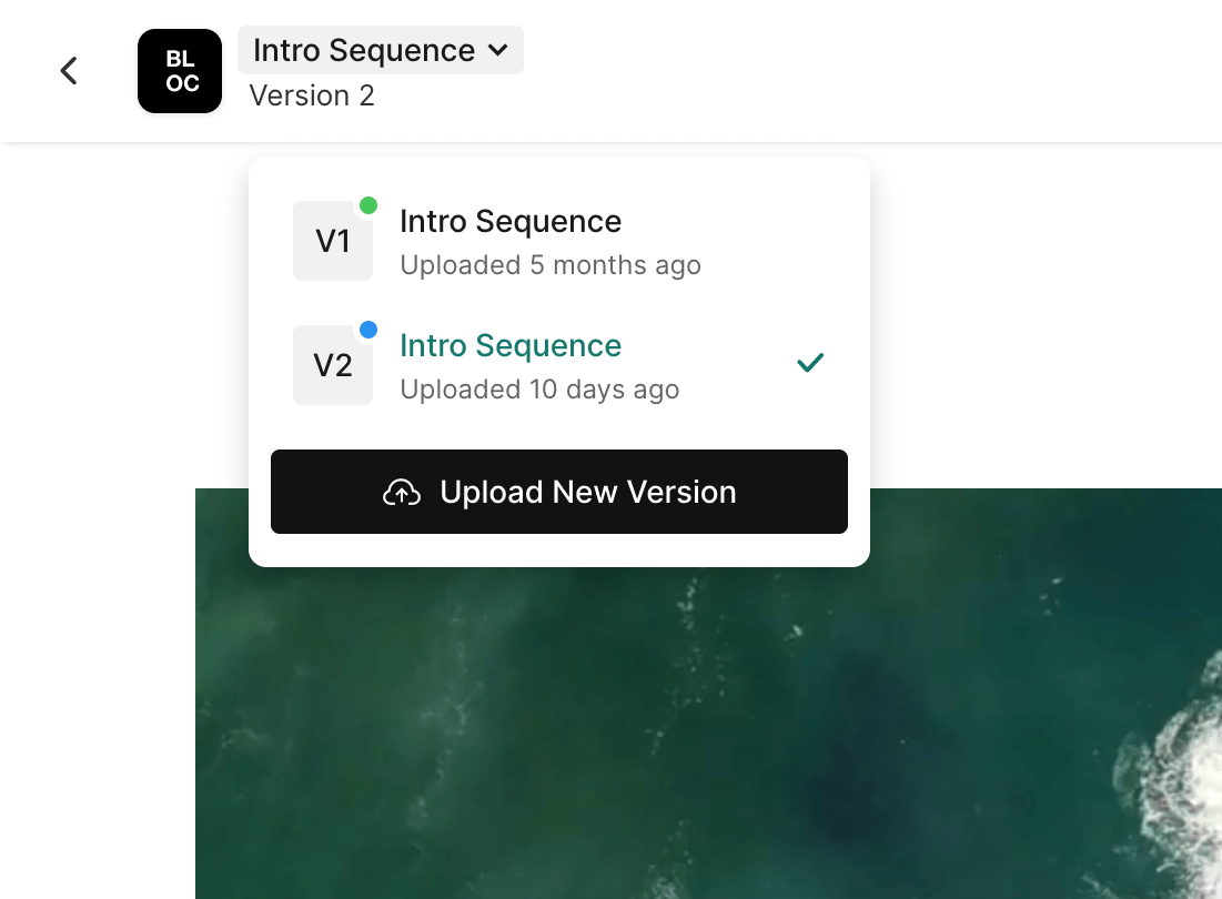 To upload a new version, open the asset you wish to update and click the Title in the upper left corner, then select Upload New Version.