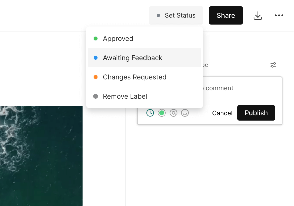 When you open up the version stack, you will see a small colored dot that correlates to the status of each version.