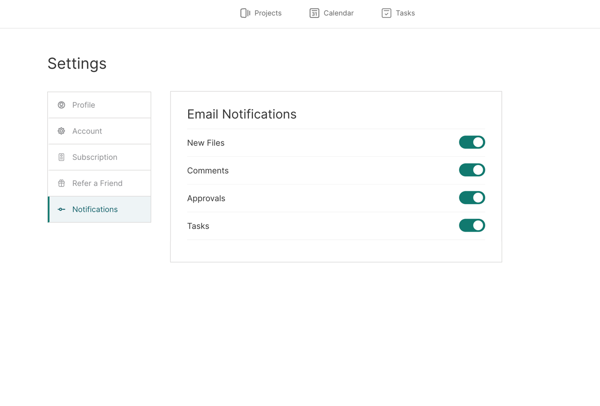 From the Settings screen, select Notifications from the sidebar. Turn on or off any email notifications you wish to receive by clicking the Toggle Switch.