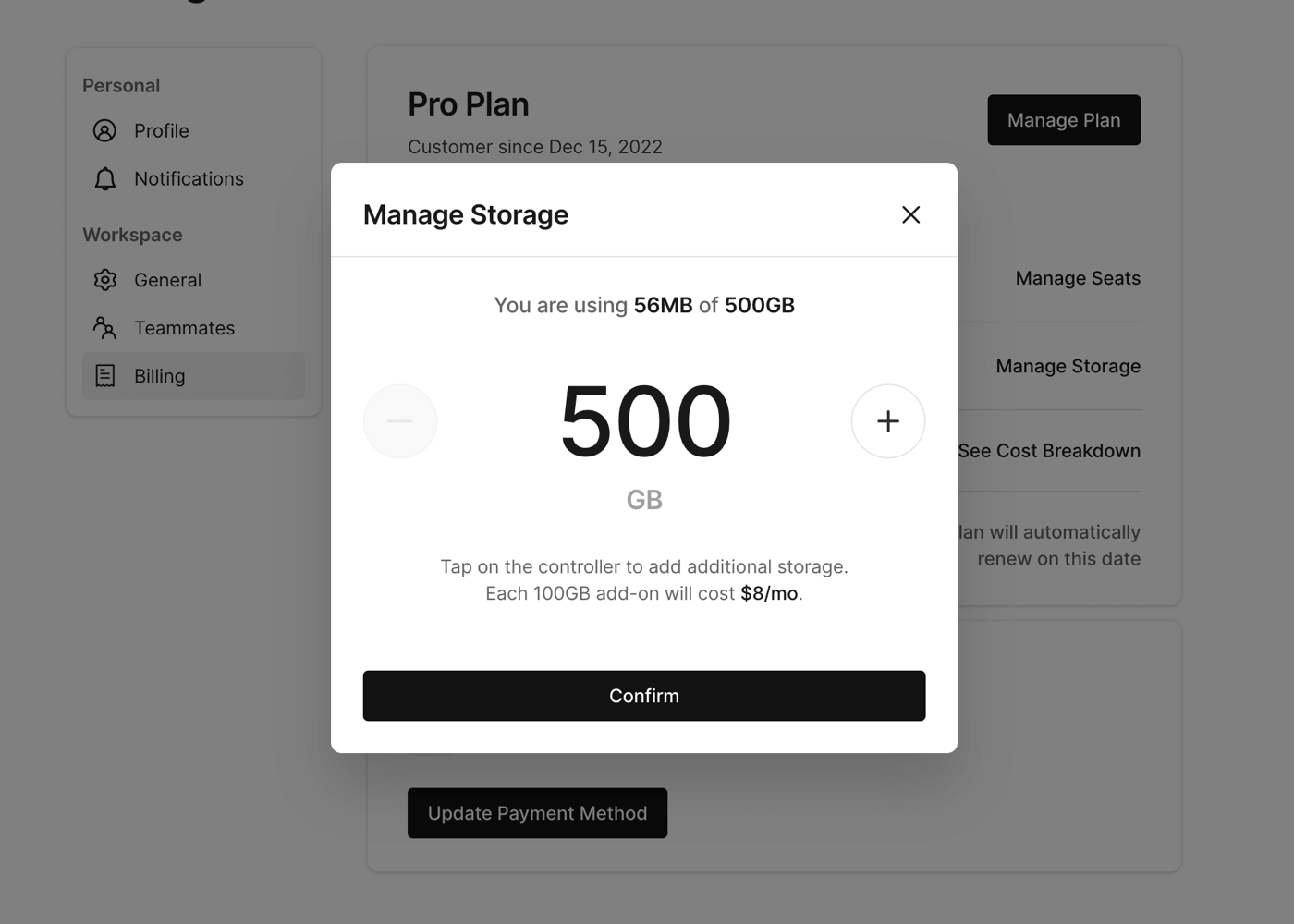 Once you have updated your storage amount, click Confirm to confirm the changes.